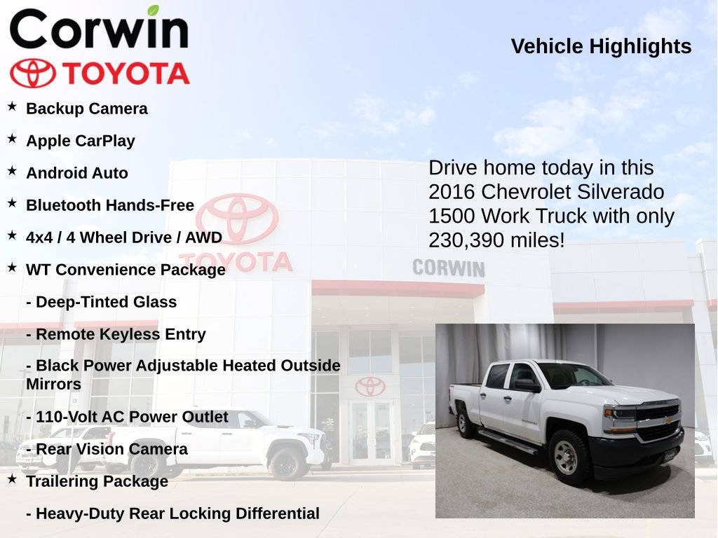 Discover the rugged capability and versatility of this well-equipped 2016 Chevrolet Silverado 1500 WT. With its powerful EcoTec3 5.3L V8 engine, 4-wheel drive, and impressive towing capacity, this Silverado is ready to tackle any job or adventure with confidence.