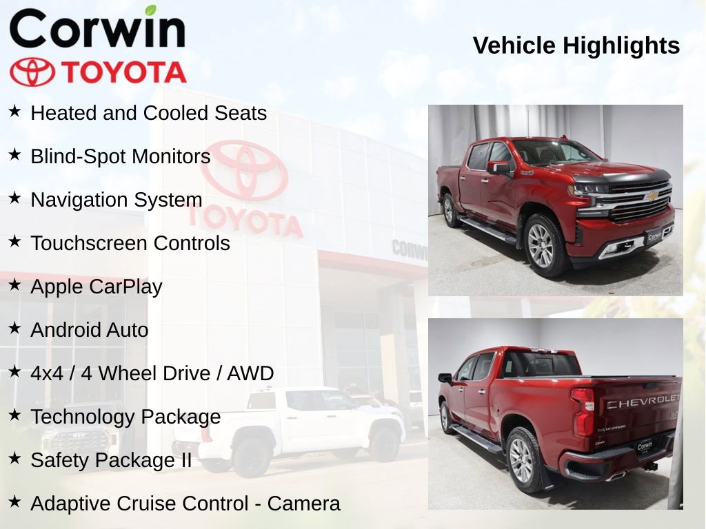 This Chevrolet Silverado 1500 is well equipped and includes the following features and benefits, Heated and Cooled Seats, Blind-Spot Monitors, Navigation System, Touchscreen Controls, Apple CarPlay, Android Auto, 4x4 / 4 Wheel Drive / AWD, 15" Diagonal Multicolor Head-Up Display, Adaptive Cruise Control - Camera, Automatic Emergency Braking, Bed View Camera, Following Distance Indicator, Forward Collision Alert, Front Pedestrian Braking, HD Surround Vision w/2 Trailer View Camera Provisions, IntelliBeam Automatic High Beam On/Off, Lane Keep Assist w/Lane Departure Warning, Rear Camera Mirror, Safety Alert Seat, Safety Package II, Technology Package. Odometer is 7777 miles below market average! 23/29 City/Highway MPG