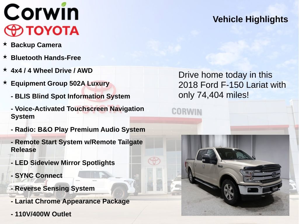 This Ford F-150 is well equipped and includes the following features and benefits, Backup Camera, Bluetooth Hands-Free, 4x4 / 4 Wheel Drive / AWD, 110V/400W Outlet, 2nd Row Heated Seats, Automatic High Beam w/Rain-Sensing Wipers, BLIS Blind Spot Information System, Electronic Locking w/3.55 Axle Ratio, Equipment Group 502A Luxury, Heated Steering Wheel, Lariat Chrome Appearance Package, Leather-Trimmed Bucket Seats, LED Sideview Mirror Spotlights, Power Glass Sideview Mirr w/Chrome Skull Caps, Power Tilt/Telescoping Steering Column w/Memory, Quad Beam LED Headlamps & LED Taillamps/Fog Lamps, Radio: B&O Play Premium Audio System, Remote Start System w/Remote Tailgate Release, Reverse Sensing System, SYNC Connect, Universal Garage Door Opener, Voice-Activated Touchscreen Navigation System, Windshield Wiper De-Icer. Odometer is 31812 miles below market average!