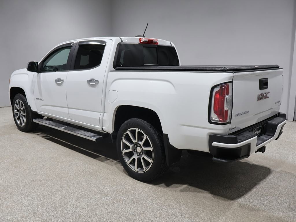 The Canyon Denali's rugged yet refined exterior is highlighted by the distinctive chrome grille, polished exhaust tip, and 20-inch ultra-bright machined aluminum wheels. This truck's versatility shines through with a spray-on bedliner, 5-inch rectangular chrome assist steps, and a rear step bumper for easy access.