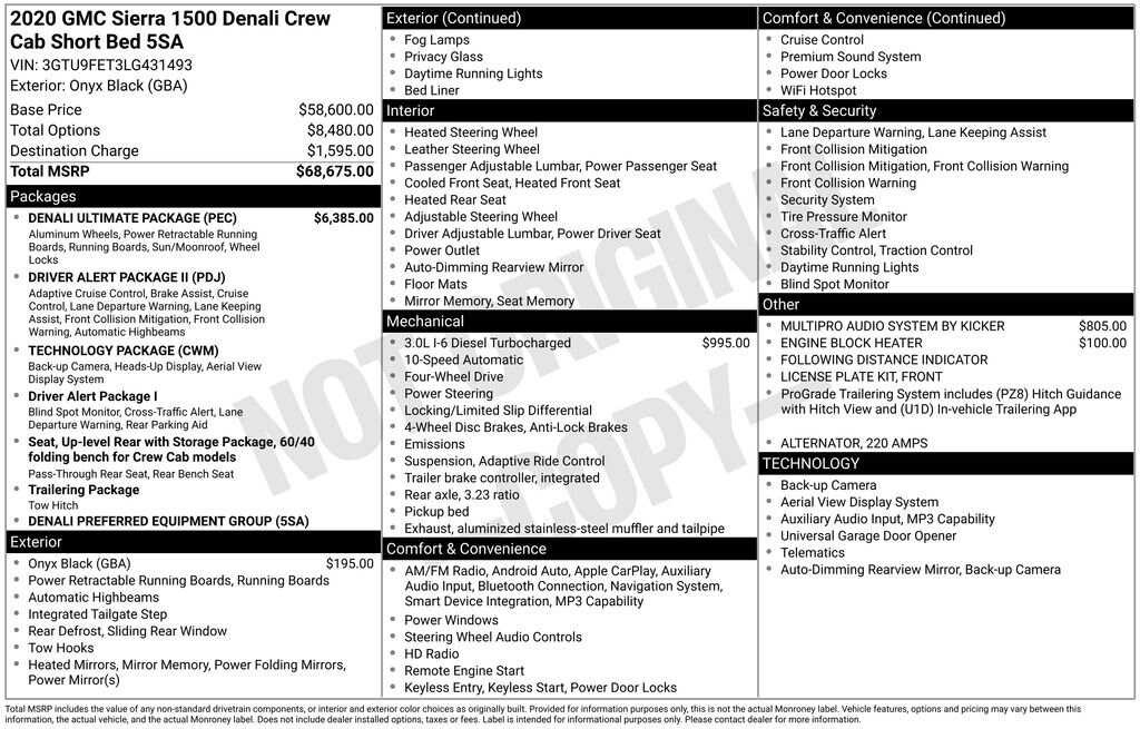 This 2020 GMC Sierra 1500 Denali, finished in the striking Onyx Black exterior, is a true masterpiece of engineering and design. With its exceptional capabilities, refined luxury, and cutting-edge technology, it's the ultimate choice for those seeking the pinnacle of full-size truck performance and sophistication.