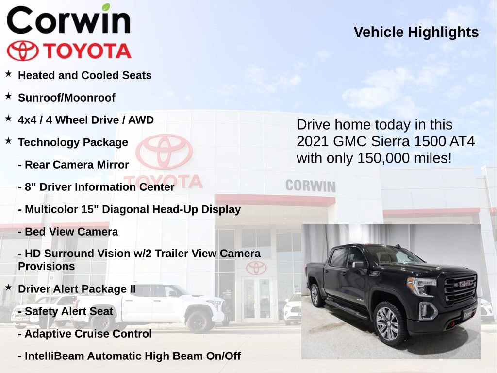 This GMC Sierra 1500 is well equipped and includes the following features and benefits, Heated and Cooled Seats, Sunroof/Moonroof, 4x4 / 4 Wheel Drive / AWD, 8" Driver Information Center, Adaptive Cruise Control, AT4 Preferred Package, AT4 Value Package, Automatic Emergency Braking, Bed View Camera, Driver Alert Package I, Driver Alert Package II, Following Distance Indicator, Forward Collision Alert, Front Pedestrian Braking, HD Surround Vision w/2 Trailer View Camera Provisions, IntelliBeam Automatic High Beam On/Off, Lane Keep Assist w/Lane Departure Warning, Multicolor 15" Diagonal Head-Up Display, Rear Camera Mirror, Safety Alert Seat, Technology Package. 22/26 City/Highway MPG