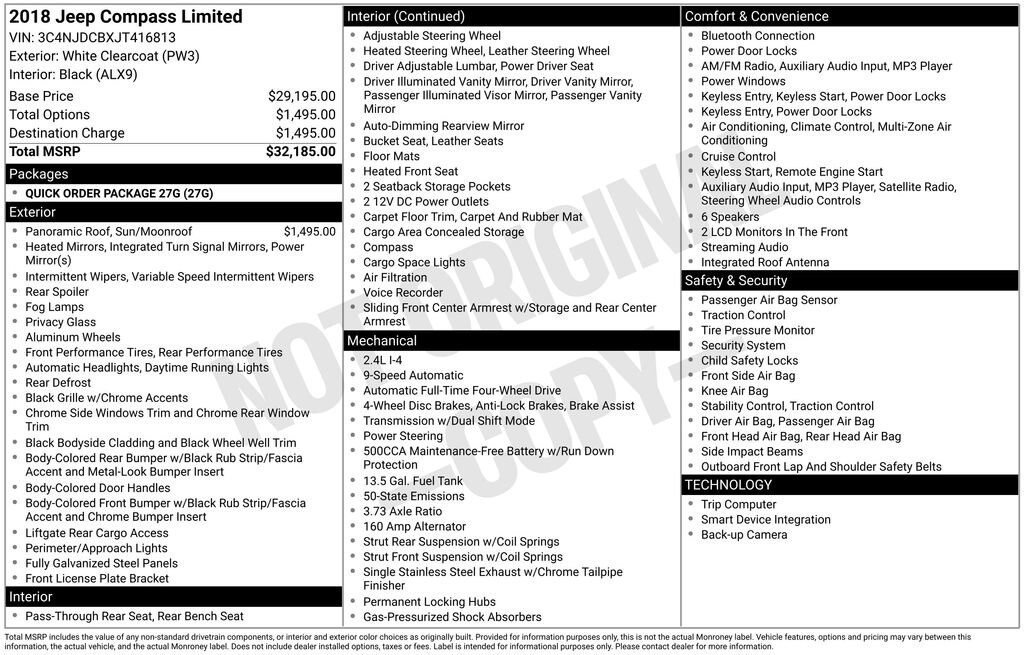 This Jeep Compass is well equipped and includes the following features and benefits, Heated Seats, Backup Camera, Apple CarPlay, Android Auto, Bluetooth Hands-Free, 4x4 / 4 Wheel Drive / AWD, Local Trade, Power Front/Fixed Rear Full Sunroof. 22/30 City/Highway MPG
