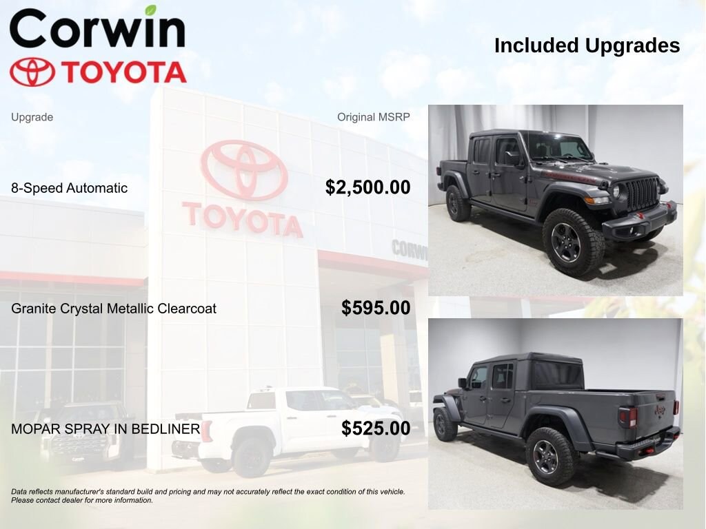 This Jeep Gladiator is well equipped and includes the following features and benefits, Navigation System, Backup Camera, Apple CarPlay, Android Auto, 4x4 / 4 Wheel Drive / AWD, MOPAR Spray In Bedliner.