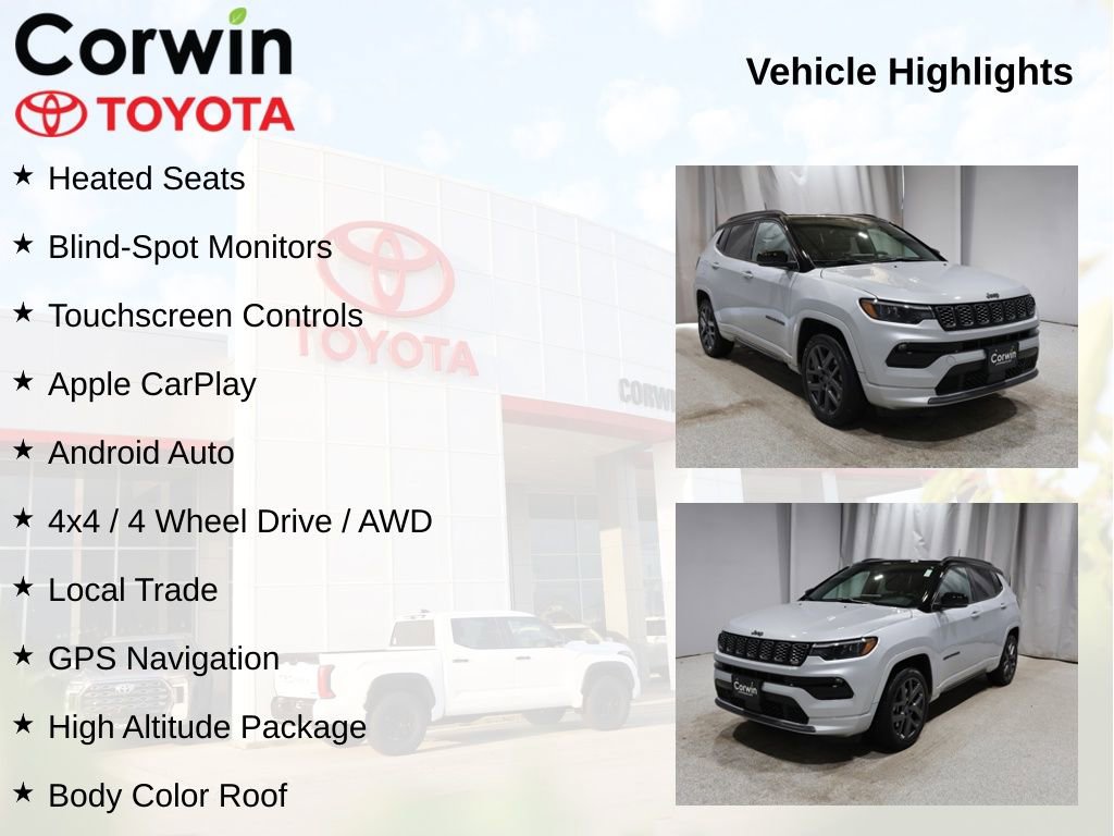 This Jeep Compass is well equipped and includes the following features and benefits, Heated Seats, Blind-Spot Monitors, Touchscreen Controls, Apple CarPlay, Android Auto, 4x4 / 4 Wheel Drive / AWD, Local Trade, 10.1" Touchscreen Display, 4G LTE Wi-Fi Hot Spot, Alexa Built-In, Black Day Light Opening Moldings, Body Color Door Claddings, Body Color Exterior Sill Moldings, Body Color Fascias, Body Color Roof, Body Color Wheel Flares, Cluster 10.25" TFT Color Display, Connected Travel & Traffic Services, Disassociated Touchscreen Display, For Details, Visit DriveUconnect.com, For More Info, Call 800-643-2112, Global Telematics Box Module (TBM), Gloss Black Surround/Neutral Gray Rings, GPS Navigation, HD Radio, High Altitude Package, Integrated Voice Command w/Bluetooth, LED Low/Highbeam Projector Headlamps, Liquid Chrome/Chainmail Hydro Accent, Neutral Gray Exterior Accents, Neutral Gray Exterior Badging, Power Front/Fixed Rear Full Sunroof, Premium Alpine Speaker System, Premium LED Fog Lamps, Premium Taillamps, Radio: Uconnect 5 Nav w/10.1" Display, SiriusXM Guardian - Included Trial (B), SiriusXM Radio Service, SiriusXM w/360L, Tungsten Accent Stitching, Wheels: 19" x 7.5" Aluminum Painted. Odometer is 9438 miles below market average! 24/32 City/Highway MPG