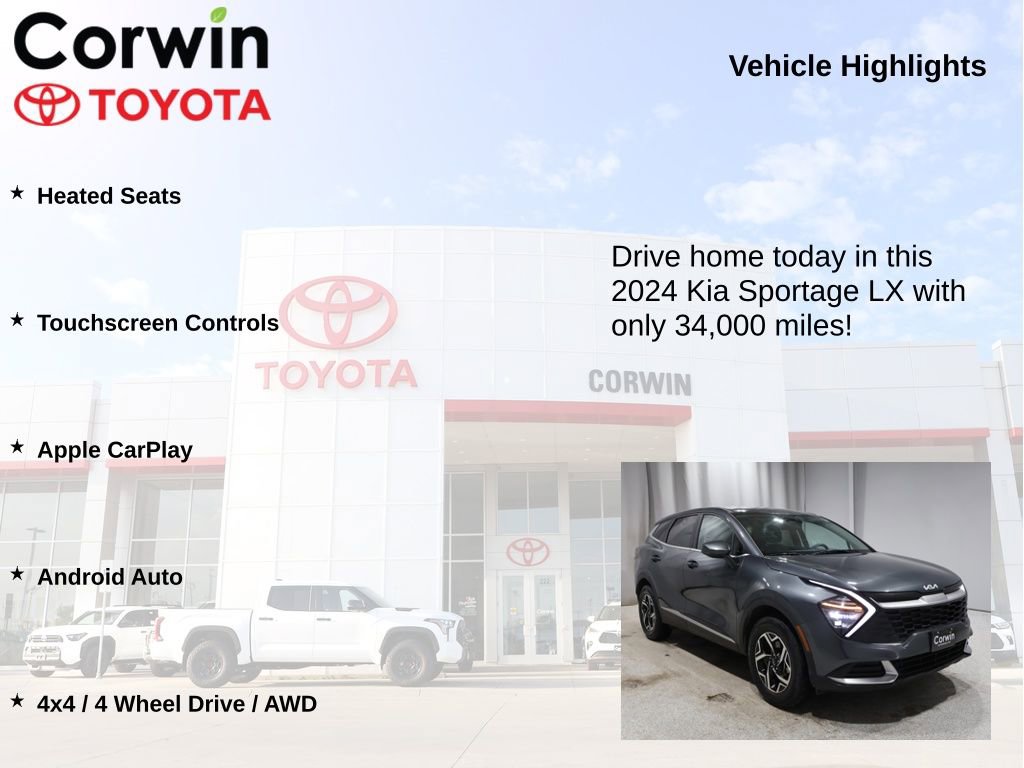 This Kia Sportage is well equipped and includes the following features and benefits, Heated Seats, Touchscreen Controls, Apple CarPlay, Android Auto, 4x4 / 4 Wheel Drive / AWD. 23/26 City/Highway MPG