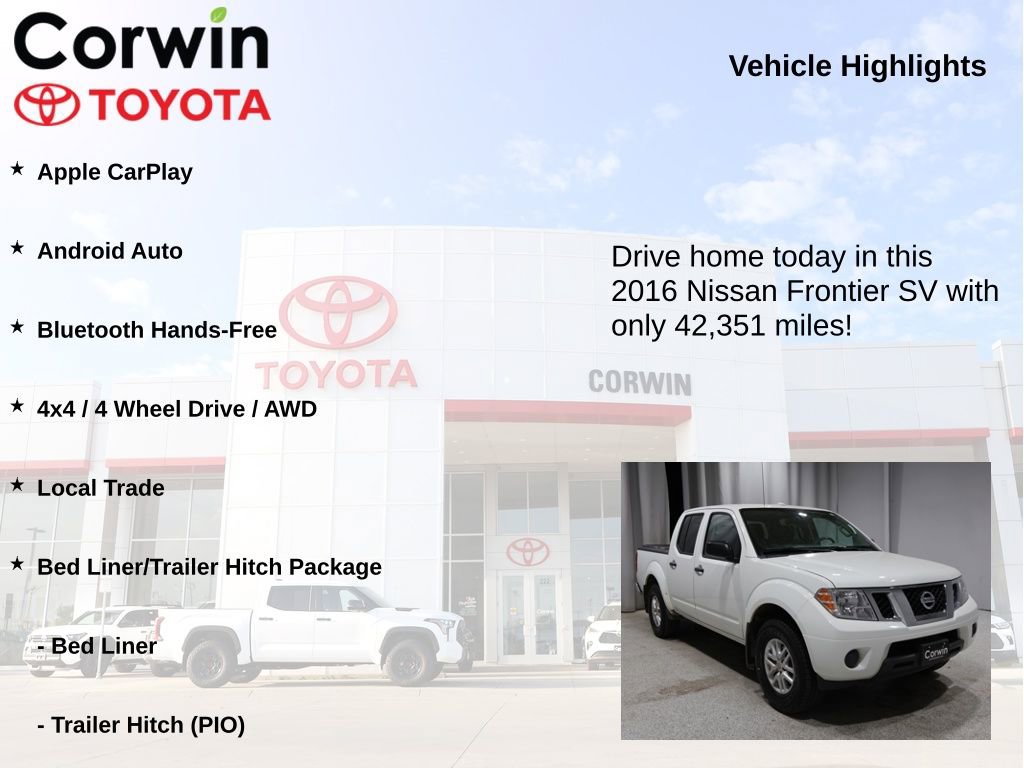 This Nissan Frontier is well equipped and includes the following features and benefits, Apple CarPlay, Android Auto, Bluetooth Hands-Free, 4x4 / 4 Wheel Drive / AWD, Local Trade, Bed Liner, Bed Liner/Trailer Hitch Package, Trailer Hitch (PIO). Odometer is 58500 miles below market average!