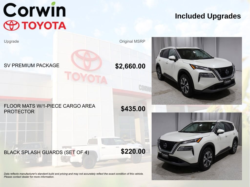This Nissan Rogue is well equipped and includes the following features and benefits, Heated Seats, Blind-Spot Monitors, Lane Keeping Assist, Backup Camera, Automatic Headlights, Apple CarPlay, Android Auto, Bluetooth Hands-Free, 4x4 / 4 Wheel Drive / AWD, Automatic temperature control, Front dual zone A/C, Heated Driver & Front Passenger Seats, Heated Leather Wrapped Steering Wheel, Leatherette Door Trim Inserts w/Stitch, Panoramic Moonroof, Power driver seat, Power Liftgate, PRIMATEX Leatherette Seat Trim (DISC), Rear Door Sunshades, Rear Personal Lights, Silver Painted Roof Rails, SV Premium Package (DISC). Odometer is 8108 miles below market average! 28/35 City/Highway MPG