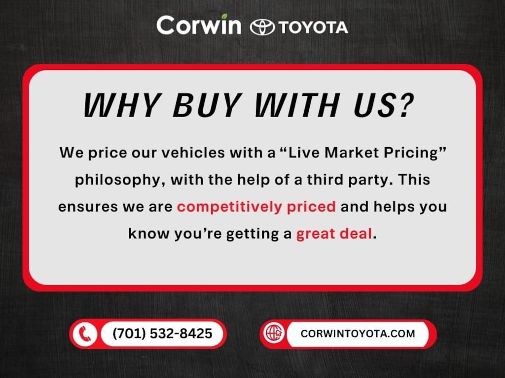 * 2013 KBB.com Best Resale Value Awards * 2013 KBB.com Brand Image Awards Friendly service, a huge selection of new Toyota vehicles, and fast flexible financing options are a few of the reasons why we are the new and pre-owned vehicle leaders in the greater Fargo Moorhead Area. Call us or stop in and see us today at Corwin Toyota! Located at 222 40th St. S. (701) 282-8425 or visit us online at CorwinToyota.com. All prices must be verified with the dealer.