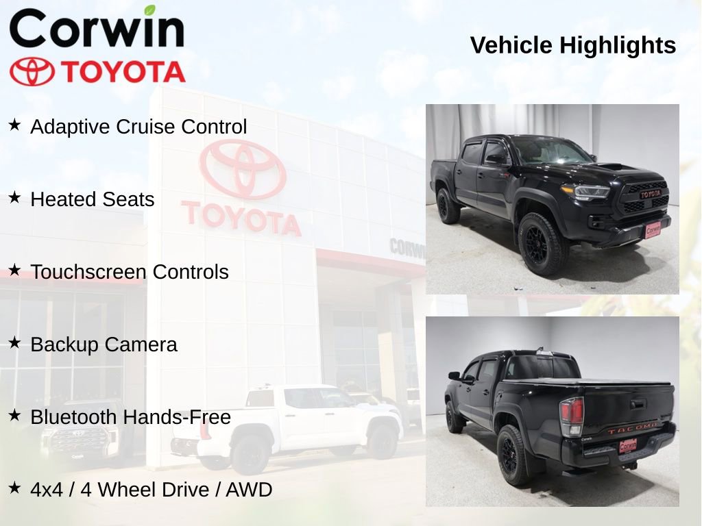 This Toyota Tacoma is well equipped and includes the following features and benefits, Adaptive Cruise Control, Heated Seats, Touchscreen Controls, Backup Camera, Bluetooth Hands-Free, 4x4 / 4 Wheel Drive / AWD.