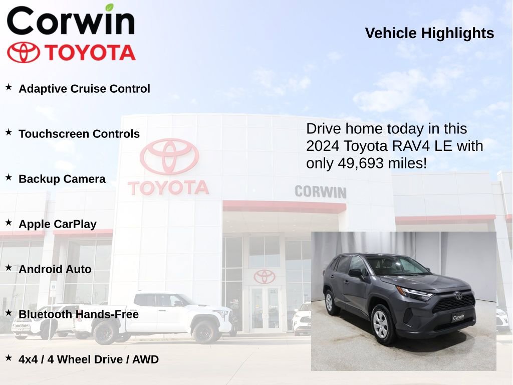 Experience the exceptional value and uncompromising performance of the 2024 Toyota RAV4 LE. Visit our showroom today and let our knowledgeable sales team guide you through a test drive. We're confident you'll be impressed by this exceptional SUV and its ability to elevate your driving experience.