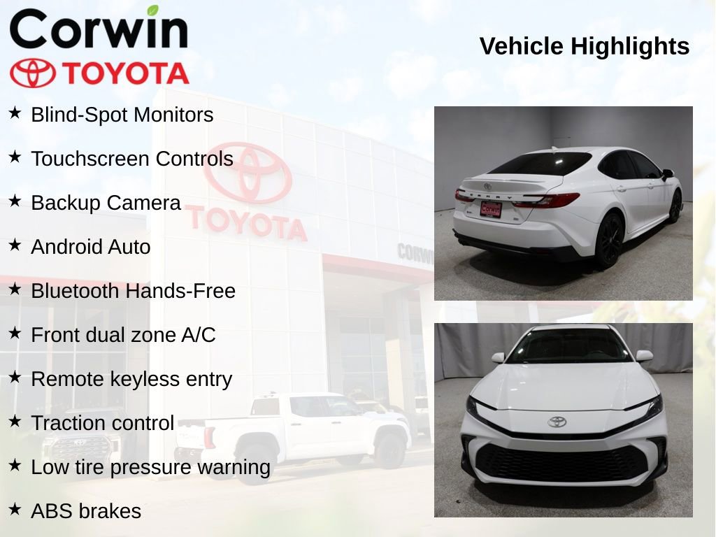 This Toyota Camry is well equipped and includes the following features and benefits, Blind-Spot Monitors, Touchscreen Controls, Backup Camera, Android Auto, Bluetooth Hands-Free, ABS brakes, Active Cruise Control, Alloy wheels, Electronic Stability Control, Front dual zone A/C, Heated door mirrors, Illuminated entry, Low tire pressure warning, Remote keyless entry, Traction control.