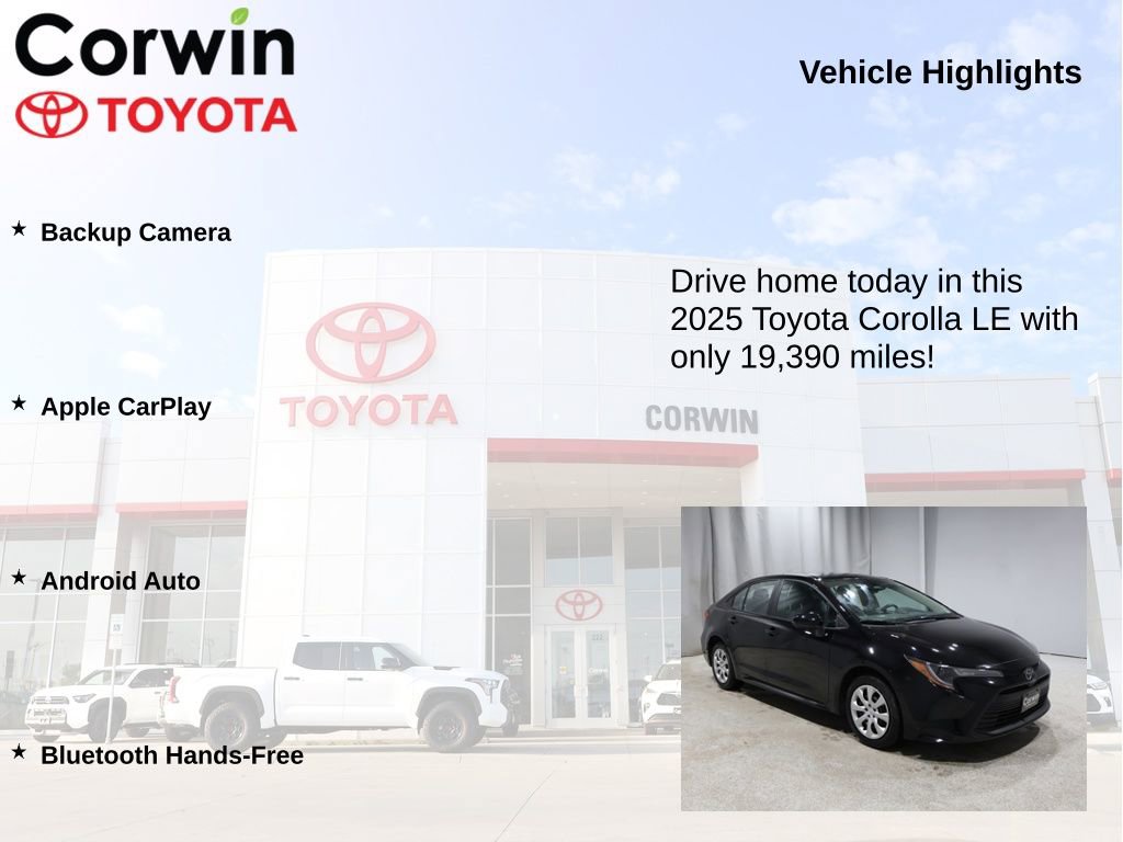 We're confident you'll be impressed by the impressive features and exceptional value of this 2025 Toyota Corolla LE. Visit our showroom today and experience the difference for yourself. We're conveniently located at 222 40th St. S. in Fargo and easy to reach at (701) 282-8425. You can also browse current inventory and offers anytime at CorwinToyota.com. Pricing and availability are subject to dealer verification.