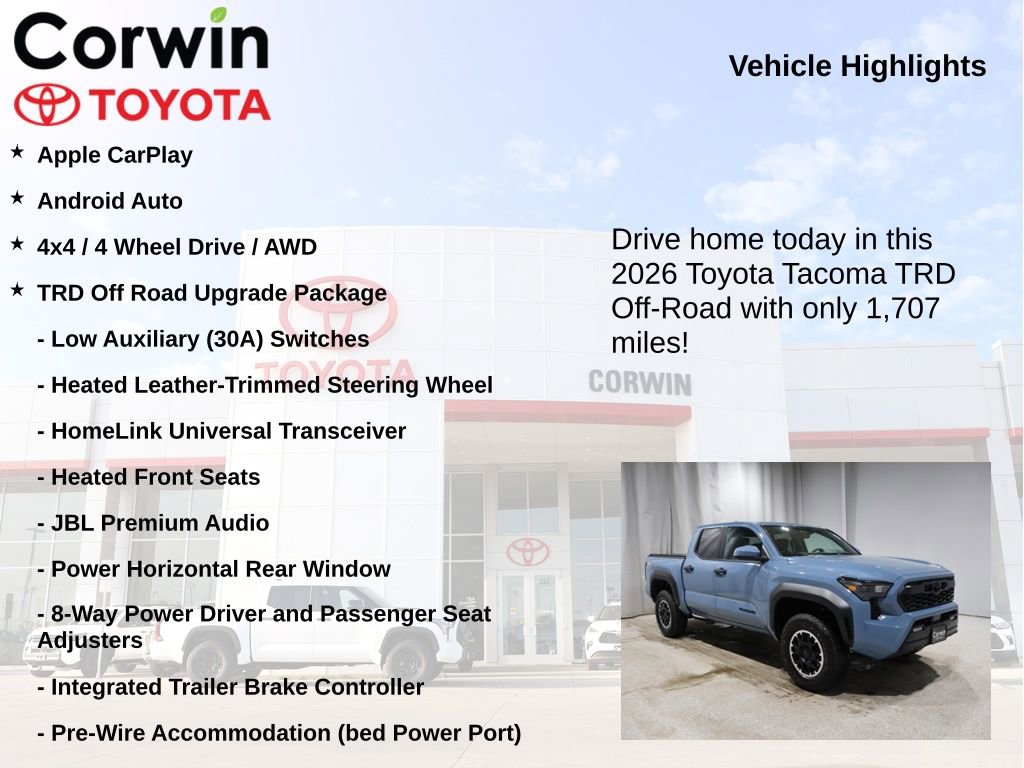 Experience the Rugged Capability and Premium Comfort of the 2026 Toyota Tacoma TRD Off-Road. This exceptional midsize truck is designed to conquer any terrain, while offering a refined and feature-rich interior that elevates your driving experience.